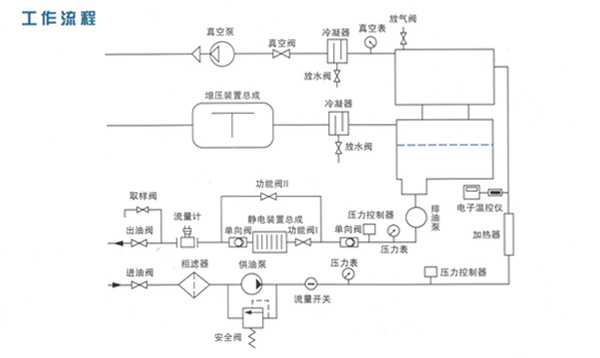 油液在供油泵的作用下由進(jìn)油口進(jìn)入粗濾器,通過(guò)粗濾器除去油中較大雜質(zhì)后經(jīng)過(guò)加熱器時(shí)被加熱到55℃左右,加熱后的油液首先通過(guò)初級(jí)真空罐內(nèi)的脫氣元件噴射到真空罐內(nèi),在真空狀態(tài)下,水份會(huì)低溫沸騰而變成水蒸氣,然后被真空泵抽出,被抽出的水蒸氣在通過(guò)冷凝器時(shí)大部分被冷凝成水,小部分透過(guò)真空排氣口排出。